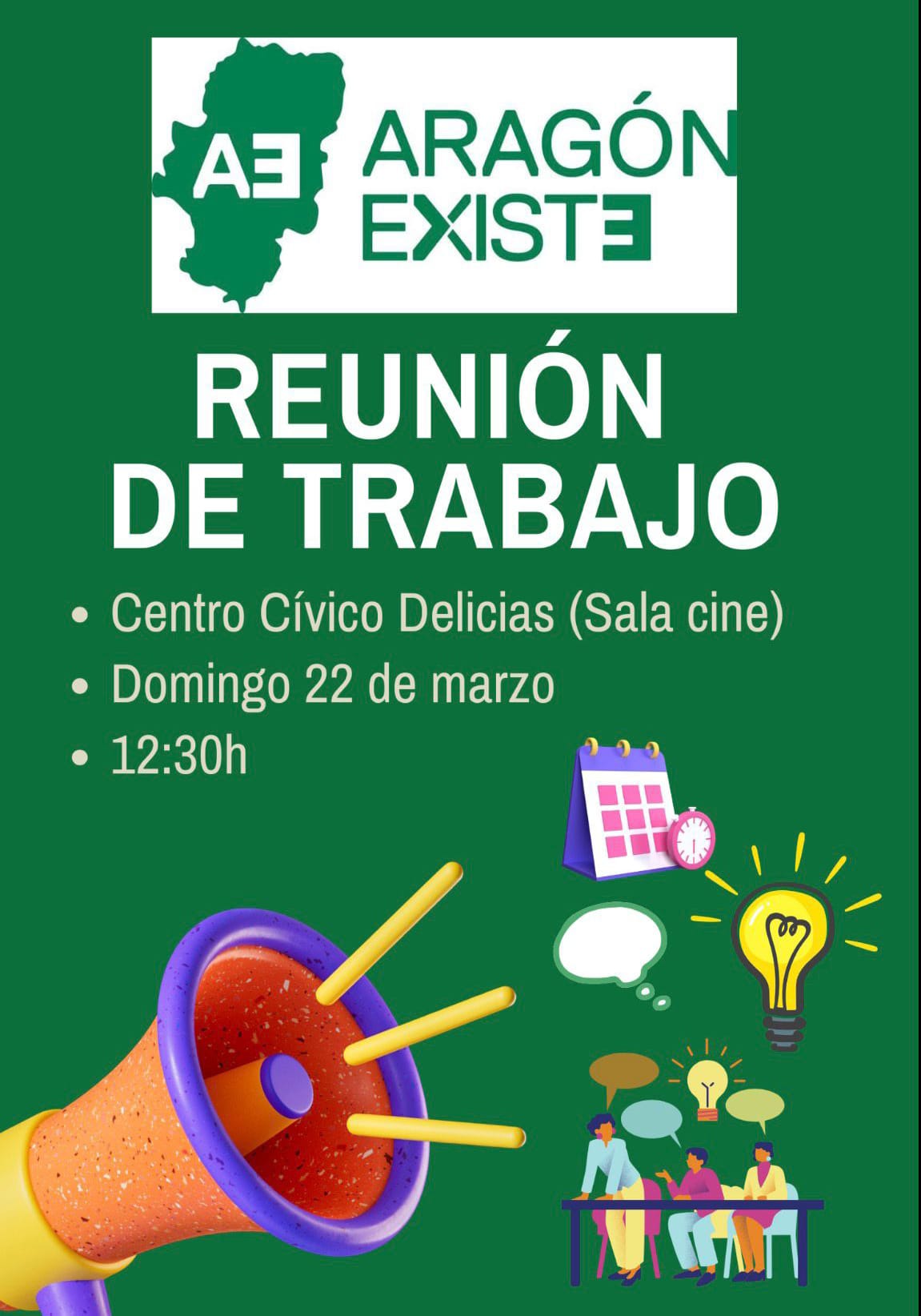 Aragón Existe llevará a cabo una jornada de trabajo el próximo domingo, 22 de marzo, en el Centro Cívico Delicias de Zaragoza. Este evento contará con la participación del coordinador general de la formación, Valero Aguayos, quien ofrecerá declaraciones a los medios de comunicación sobre los temas que se tratarán durante la reunión.
