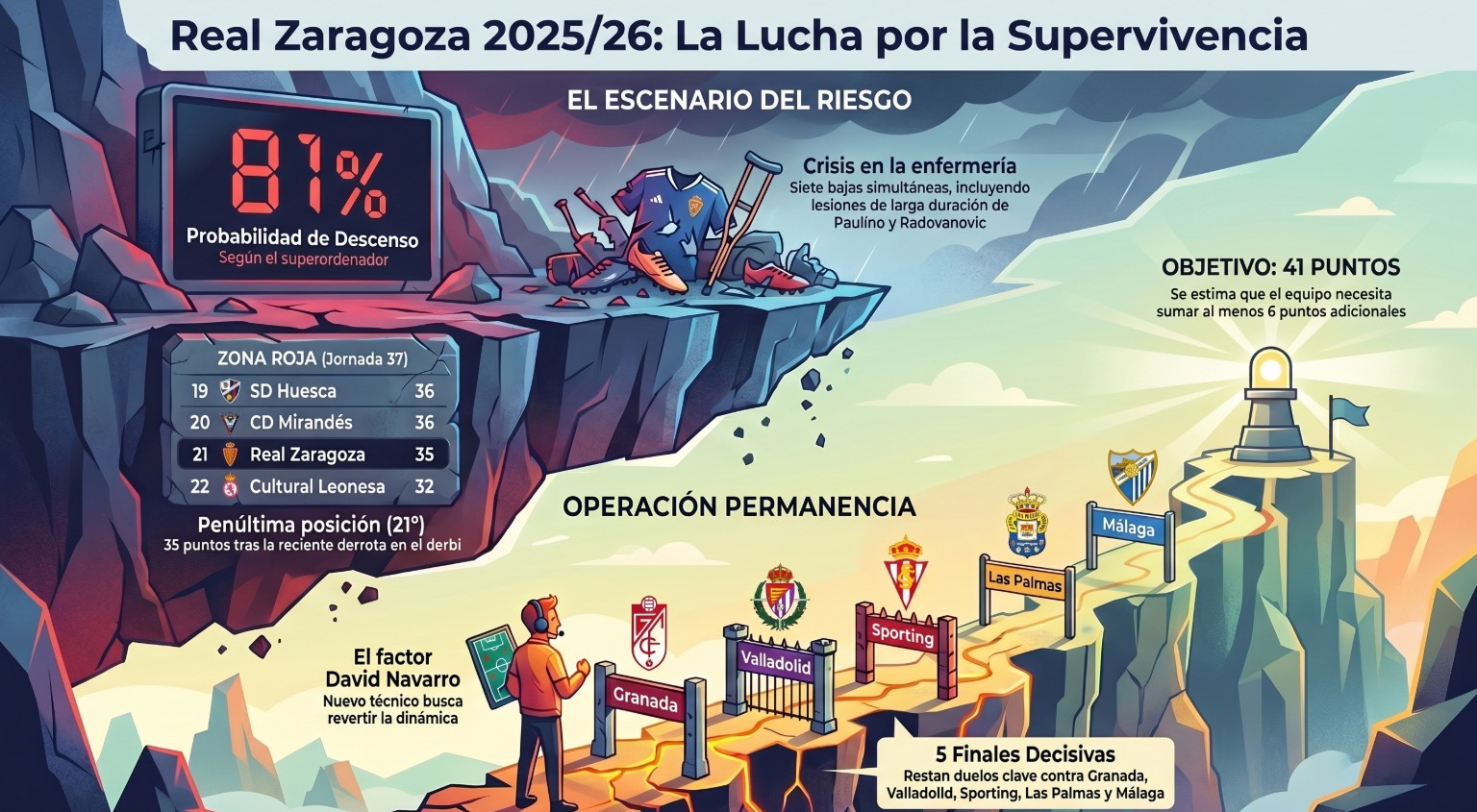 Los datos son fríos y dolorosos. Según las proyecciones del superordenador de LaLiga Hypermotion, el Real Zaragoza tiene un 81% de probabilidades de descender de categoría. Este modelo estadístico sitúa al club maño como uno de los cuatro equipos con mayor riesgo de caer a la Primera Federación, proyectando una puntuación final de entre 40 y 41 puntos, una cifra que históricamente no suele garantizar la permanencia.