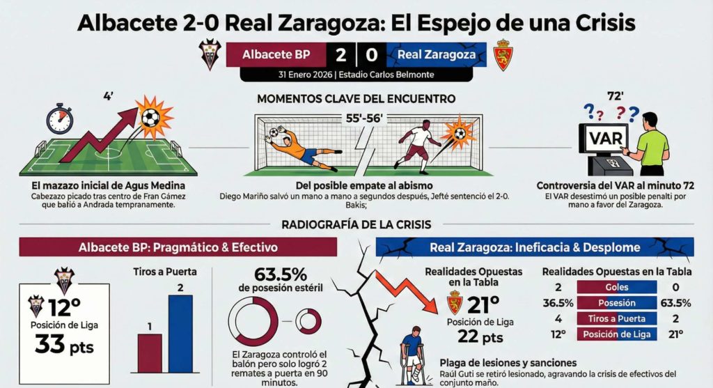 El Real Zaragoza volvió a cosechar una derrota en su visita al Carlos Belmonte (2-0), esta vez ante un Albacete que impuso su ley desde el primer minuto. El equipo de Rubén Sellés, con Esteban Andrada bajo palos, nunca encontró fluidez ni profundidad y acabó doblegado por los goles de Agus Medina y Jefté Betancor. La reacción tras el primer tanto no llegó, y cuando quiso hacerlo, el 2-0 ya era una losa imposible.