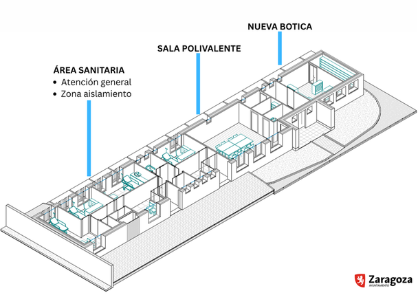 El área de atención primaria incluirá el acceso principal al consultorio, con una sala de espera y tres consultas: una polivalente, una consulta enfermera y una consulta médica. También se habilitarán cuartos de servicios, limpieza y almacenes. La zona de aislamiento tendrá un acceso secundario y estará destinada a atender enfermedades más infecciosas.