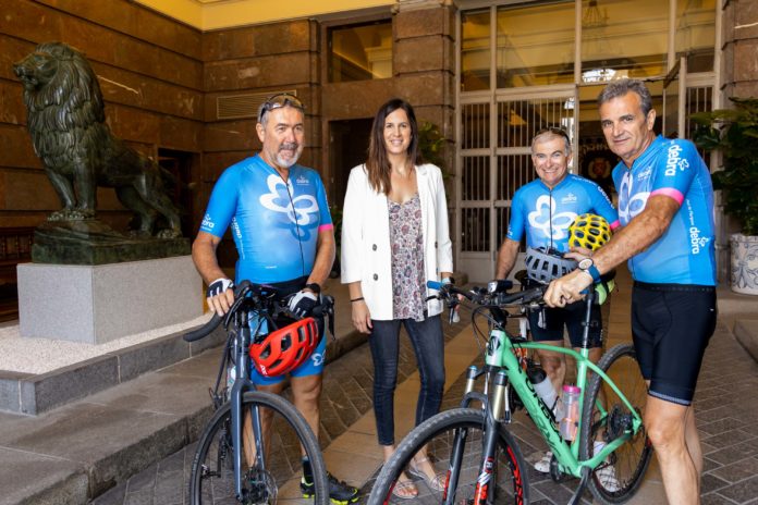 La concejala de Deportes del Ayuntamiento de Zaragoza, Cristina García, ha recibido hoy a tres ciclistas que se han propuesto pedalear, con fines solidarios, los 1.100 kilómetros que separan Barcelona de Santiago de Compostela. El objetivo es dar visibilidad y recaudar fondos para la Asociación DEBRA, referente a nivel nacional en Epidermólisis bullosa o Piel de Mariposa, una enfermedad rara, genética e incurable a día de hoy, que provoca extrema fragilidad de la piel.