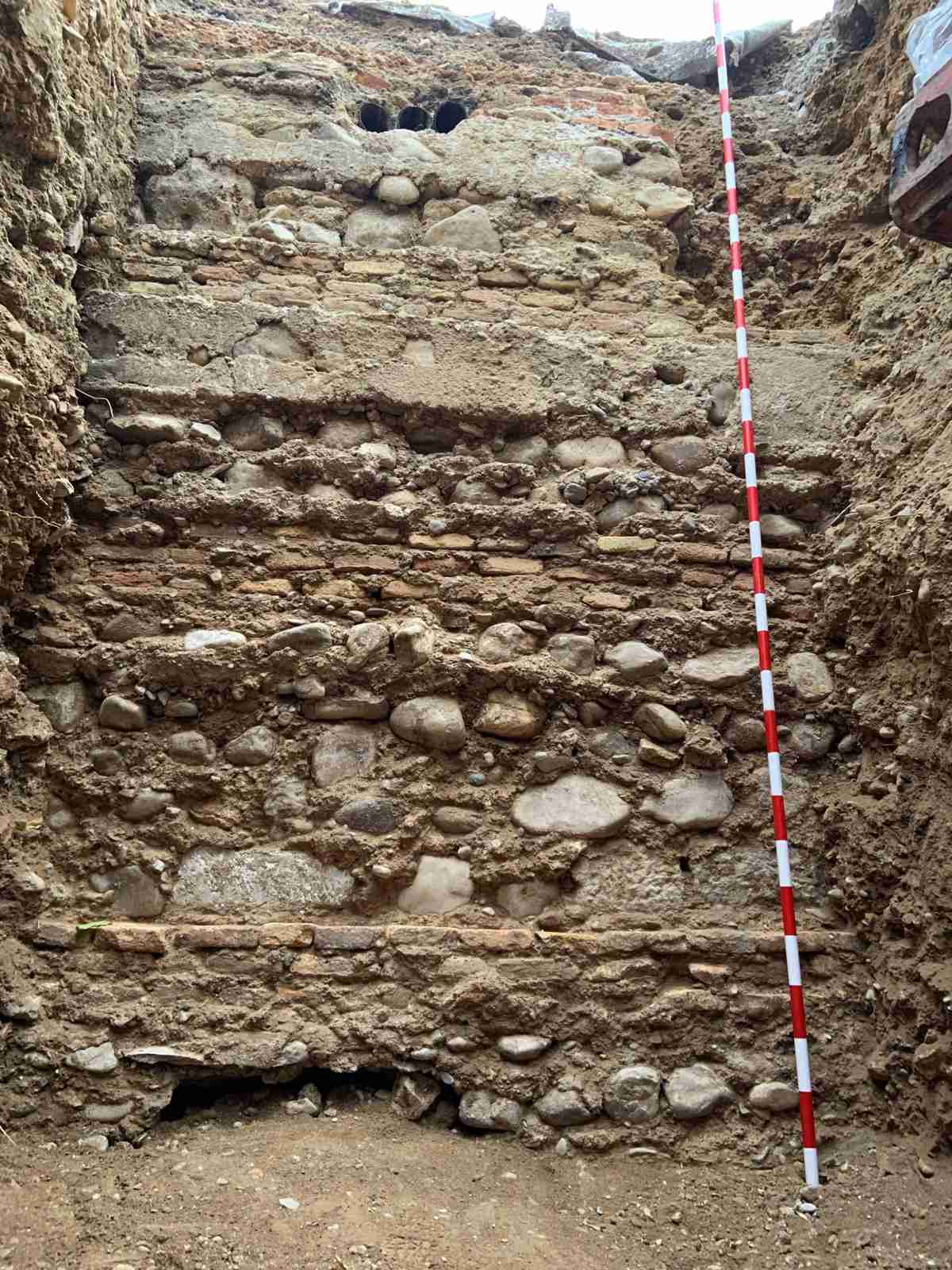 Uno de los hallazgos más destacados es parte de la cimentación de un tramo de la muralla medieval de la ciudad. Este hallazgo incluye cimentaciones y bodegas de casas que cerraban la plaza por el sur. Sin embargo, los restos han sufrido daños debido a la instalación de servicios de agua, alumbrado y telecomunicaciones que se realizaron en décadas pasadas.